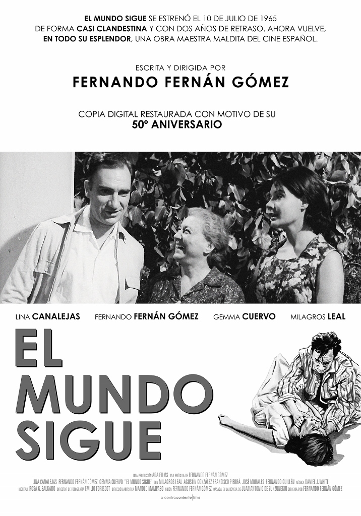 10 de julio de 1965. Bilbao, Cine Buenos Aires. Sesión doble de estreno. Una de las dos películas se titula El mundo sigue. La protagoniza Fernando Fernán Gómez junto a Lina Canalejas y Gemma Cuervo. Aunque dentro del cartel aparezca su nombre en segundo lugar, el suyo es un personaje secundario. Un poco más abajo se repite: también es el director. Esto último no sorprenderá a quien lo lea. Auténtico intérprete estrella de nuestro cine, Fernán Gómez ya ha dirigido hasta ese momento siete películas, algunas con éxito como La vida por delante (1958), La vida alrededor (1959) o La venganza de Don Mendo (1962). Aquí sucede, sin embargo, algo extraño. Al decir que la película se pasa de estreno en el Buenos Aires de Bilbao, significa que se estrena en ese cine y en esa ciudad. El mundo sigue no se proyecta en Madrid. Ni si ha proyectado antes, ni lo hará después comercialmente. Tampoco se anuncia en Barcelona. Es una película que apenas existe. Quizás resulta mala, un título de relleno para sesiones dobles que sus responsables se han sacado de la manga apresuradamente, un repudio por parte de los mismos. Este destino, estrenarse en Bilbao, en el cine Buenos Aires, tal vez se deba a que es realmente una película cualquiera. Pero no, El mundo sigue no es una película cualquiera, sino todo lo contrario. Y por ello, por resultar de veras excepcional, y excepcional en varios sentidos de la palabra, conoce esta llegada tan marginal al público. Es un film silenciado. Velado. Lo terminaron y no se vio. Hasta el día de hoy.