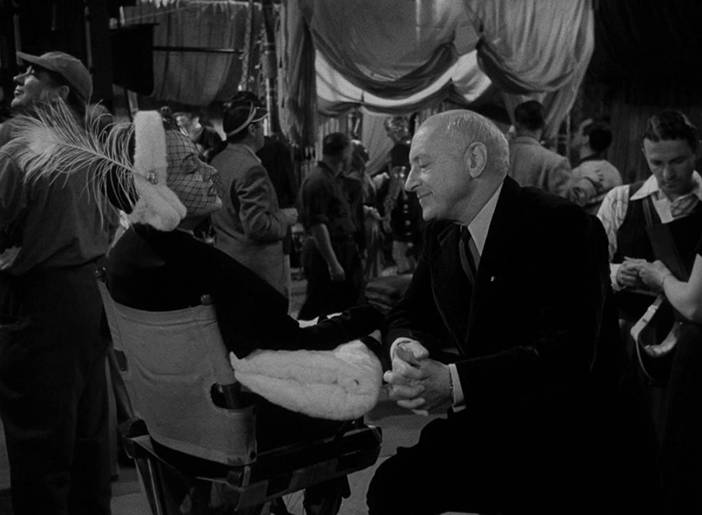 Y precisamente DeMille hace de él mismo en los estudios de la Paramount. Se trata de otra de las secuencias clave de la película. Norma Desmond piensa en él para que dirija su ansiada vuelta a la pantalla. Como no consigue hablar con él por teléfono, decide ir personalmente al plató donde este trabaja. La diva sale de su jaula de oro y visita el estudio donde fue reina y donde ahora solo es un fantasma. DeMille, el rey del cine espectáculo, la dirigió en los buenos tiempos. Mientras que ella cayó en el olvido, él sí que supo lidiar con la transición del cine mudo al hablado, y sigue al mando de superproducciones espectaculares.