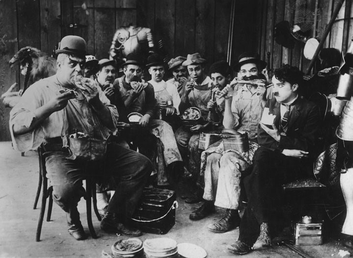 Charlot prepara con diligencia los distintos decorados, pero, ¡ay!, provoca sin querer el desorden por donde pasa; también juguetea con los objetos que se le rebelan y se convierten en obstáculos. He aquí varios ejemplos: una columna baila en sus brazos y arruina la toma; una cámara impide su trabajo, y la tira cada vez que pasa al lado de ella; recoge unas sillas para trasladarlas a su espalda y parece un puercoespín o un caracol con la casa a cuestas; peina y acicala con cuidado una alfombra con la cabeza de un oso; tiene una divertida secuencia con una palanca que abre y cierra una trampilla, donde todos, actores, su jefe y el director, acaban en un foso… o, por fin, puede comer con sus compañeros en una divertidísima secuencia donde su vecino le proporciona más de un dolor de cabeza, olores que no desea y algún que otro delicioso bocado. Precisamente, después del almuerzo, los trabajadores tratan de echarse la siesta y, al ser interrumpidos por el encargado, deciden organizar una huelga en la que su jefe y Charlot no participan. Las secuencias de los almuerzos cada vez son más elaboradas en las películas de Chaplin, como podrá comprobarse más adelante en sus largometrajes La quimera de oro o Tiempos modernos.
