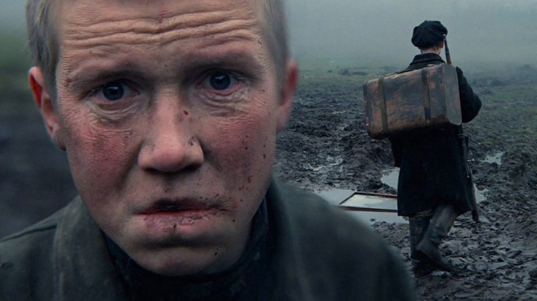 Aprovechando la conmemoración del cuarto aniversario de la derrota alemana en la Segunda Guerra Mundial, Elem Klimov se propuso emprender otro viaje a las tinieblas, esta vez entrando de lleno en las atrocidades nazis, y en coincidencia con la narración sobre el abrupto y más que traumático fin de la infancia de su protagonista (Alekséi Krávchenko), un niño de trece años llamado Flyora que, durante la ocupación de Bielorrusia por Alemania, se une a los partisanos. Lo que argumentalmente se ciñe a la crudísima recreación de la Masacre de Jatyn cometida por la infame Brigada Dirlewanger de las SS, se convierte en manos de Klimov en una cinta antibélica hecha a partes iguales de realismo y delirio, durante una sucesión de escenas —a veces con un tono reposado, pero muchas otras plasmando una intensidad desquiciada— en las que el chaval atraviesa frondosos bosques, se sumerge en ciénagas o se encuentra en medio de vastos yermos cubiertos por la niebla; que se ve bajo las bombas que caen del cielo y se topa continuamente con la muerte de cara; que lo rodean centenares de aldeanos desesperados, se mancha de fango y sangre a la luz de las llamas, asiste a matanzas o le ponen un pistola contra la sien para salir en una foto como trofeo de caza.